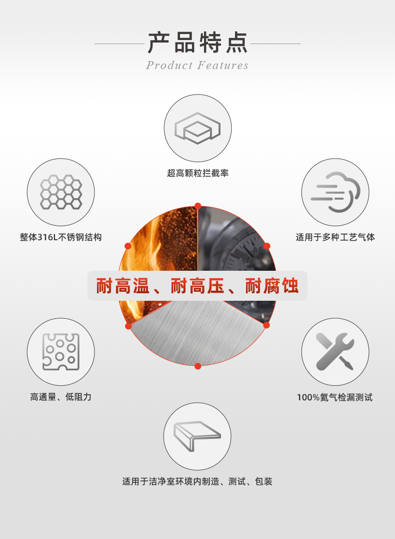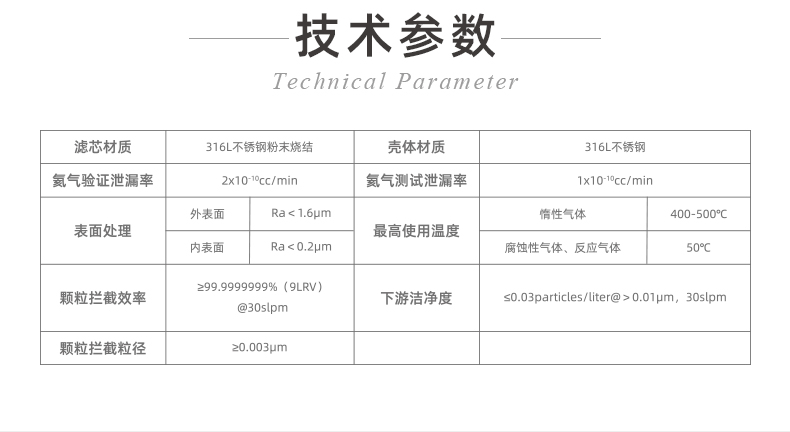 該過濾器采用整體 316L 不銹鋼結構,憑借其出色的耐高溫、耐高壓與耐腐蝕特性,從容應對半導體工藝中各類嚴苛的氣體環境,無論是光刻、刻蝕還是薄膜沉積環節,都能穩定運行。同時,過濾器通過 100% 完整性測試與氨氣檢漏測試,杜絕泄漏風險,確保氣體輸送的安全性與穩定性。
