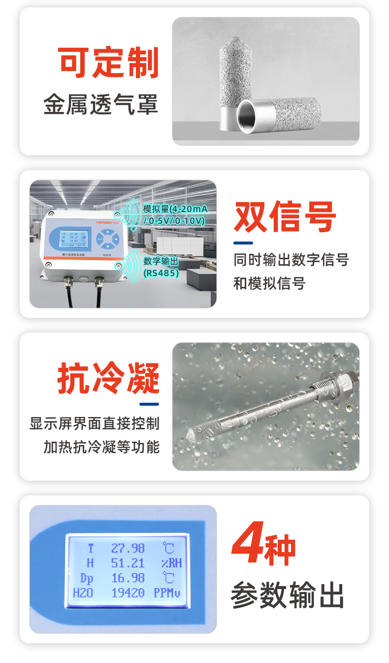 ●模擬信號輸出:溫度+濕度(露點值僅供參考) ?4~20mA/0-5V/0-10V(三選一)